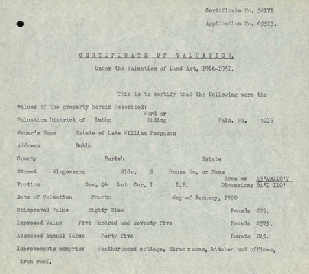 Bill Ferguson did not leave a will and his estate was not probated until 1954. His estate was worth over 500 pounds – the family home in Wingewarra Street Dubbo.
