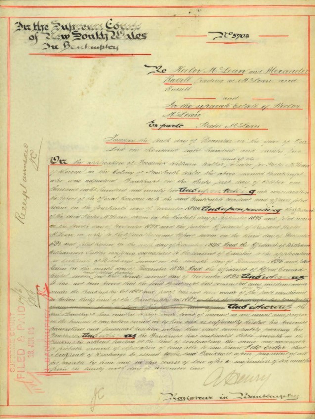 Hector McLean was a blacksmith in Dubbo. He was in business with Alexander Russell. Hector McLean was declared bankrupt on 21 October 1892. Hector McLean and Alexander Russell both borrowed money to buy a blacksmith business. Hector McLean stated that one of the causes of his bankruptcy was the reduced number of wool teams coming to Dubbo. This was due to a dispute between the graziers of the Coonamble district and the Carriers Union of Dubbo. The Coonamble graziers did not send any of their wool to Dubbo Railway Station for transport to Sydney. Instead they sent their wool to Nevertire Railway Station. He also stated that neither he or his partner Alexander Russell understood book-keeping. The partners’ unsecured liabilities were over 118 pounds and their unencumbered assets were 62 pounds. Hector McLean also had 9 pounds of debts. His bankruptcy was discharged in 1896.