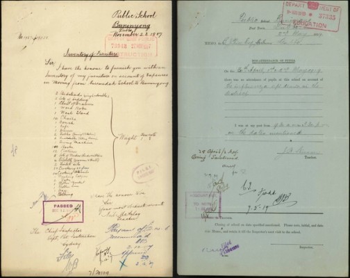 There are similarities between all of the school files through content and purpose. They reflect their times. The files cover both wars but particularly reflect the many impacts of World War 1. Women resign or are terminated when they marry as married women were barred from public sector employment. Schools very strongly reflect the growth or decline of towns.