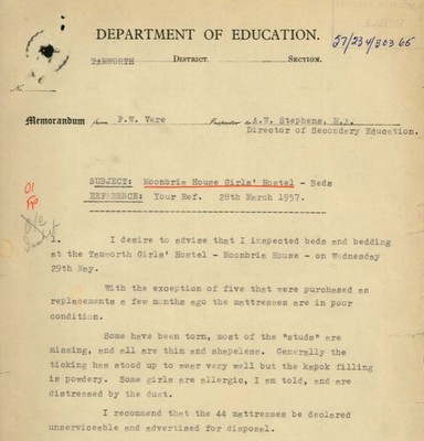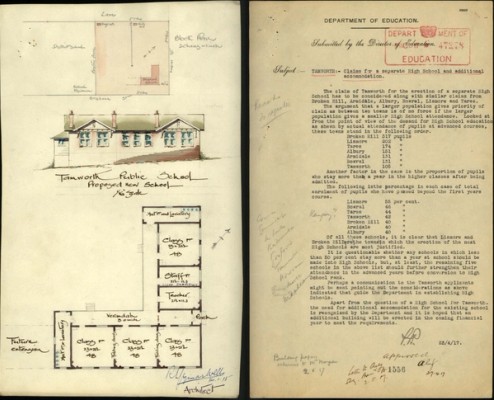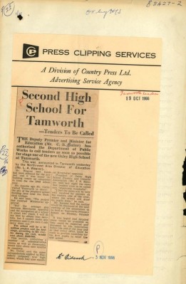 The school files show the commencement and growth of the government school system from the first Tamworth school in 1855 which later became Tamworth Public School. A second public school opened in 1883 in Tamworth West. Both of these schools offered secondary schooling until Tamworth High School was established in 1919. Two more public schools started in the 20th century - Oxley Vale Public School in 1947 and Tamworth South Public School in 1952. The second high school – Oxley - opened in 1968.