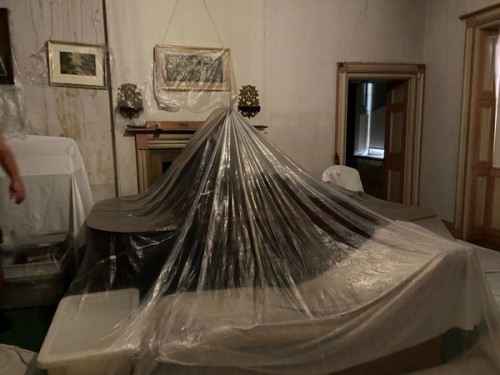 The scaffolds are up, allowing the team to look closely at windows and roofs. The arcade and main house verandah roof sheets have been carefully repaired in situ and coated with oil, and broken slates and lead flashings replaced on the main house. Desalination (removal of salts) has been completed in areas of rising damp, and joinery on the main house and stables has been removed and repaired.
