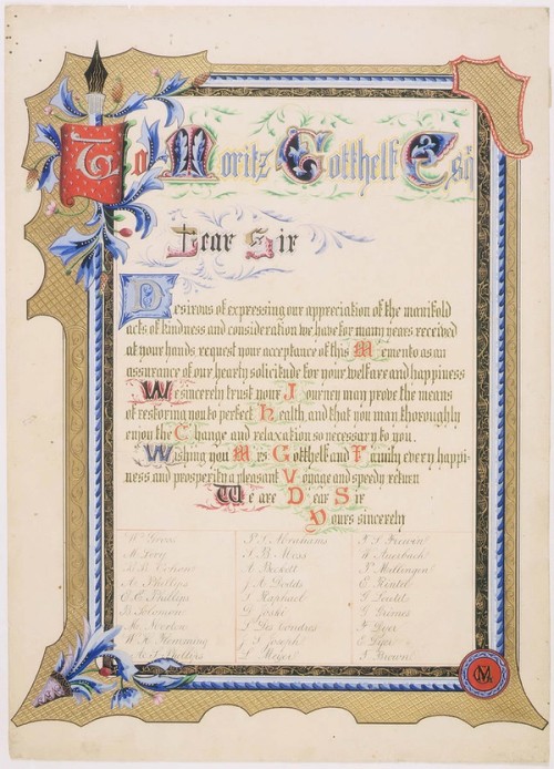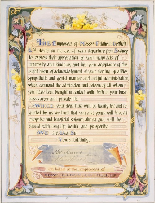 Gotthelf appears to have retired around 1911, after decades of service – including 20 years on the council of the Sydney Chamber of Commerce. Around this time he took an extended trip away from Sydney, an occasion marked by the presentation of an illuminated address by the employees of Feldheim Gotthelf Ltd, expressing their gratitude and well wishes to him.