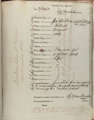 6. The memorial suggests the application was made in 1819, whereas a subsequent record from 1822 states that the ticket of leave was granted in December 1817: Petitions to the Governor from Convicts for Mitigations of Sentences, 1810–1826, NRS-900-1-[4/1856], p88, State Archives Collection, MHNSW.