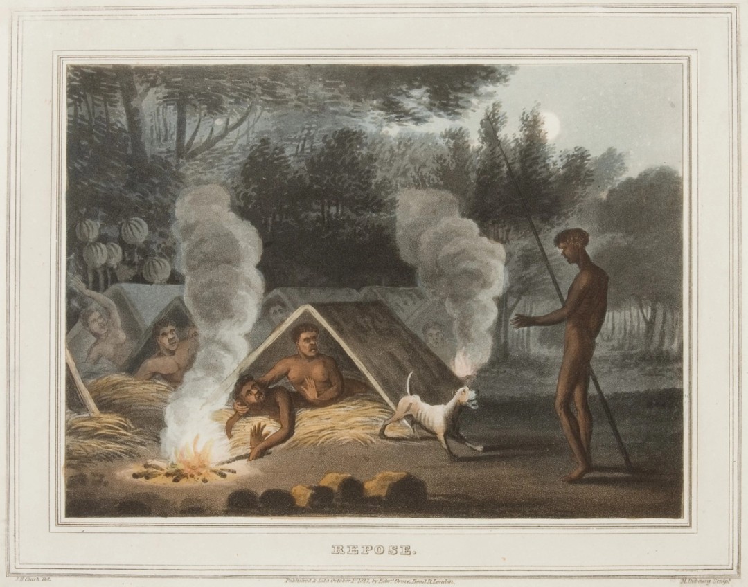 5. The print Repose from the Beat Knoblauch Collection on display in the exhibition depicts a gunya. However, it is an image crafted from the imagination of an artist who had never even visited Sydney. In 1813, London publisher Edward Orme produced a book of hand-coloured aquatints by artist John Heaviside Clark (with accompanying text) titled Field sports of the native inhabitants of New South Wales. The book catered to the European appetite for imagery of ‘exotic’ locales as Britain expanded its global empire. It is speculated that Clark based his illustrations on written descriptions of First Nations peoples and NSW flora and fauna. See: Alisa Bunbury, exhibition catalogue, Deutscher and Hackett, 2023, www.deutscherandhackett.com/auction/lot/field-sports-native-inhabitants-new-south-wales-c1813