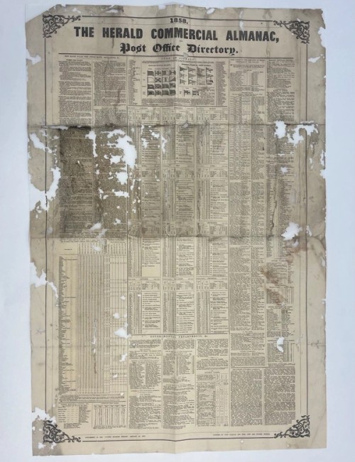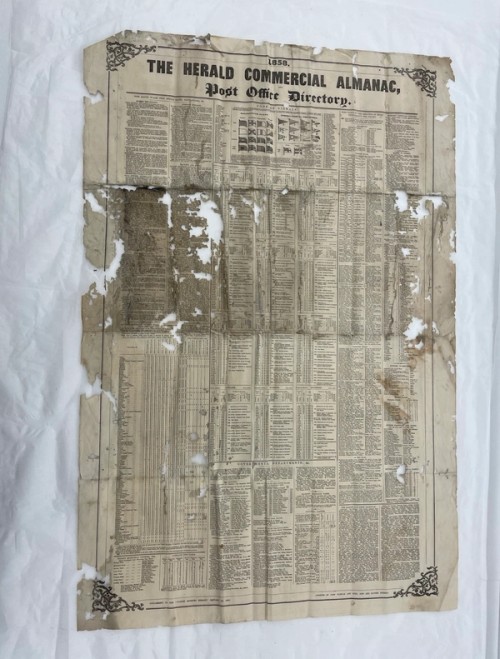 Conservator Abigail Hundley has been preparing a box of signalmen’s records (RNCG-6772-1-[A4382]) recently requested by a reader. An almanac and post office directory – a supplement to The Sydney Morning Herald from 1 January 1858 – in very poor condition was found within this box of records. The item had suffered extensive insect damage in the past. It could not be handled as the paper resembled lace from the damage and was incredibly brittle.