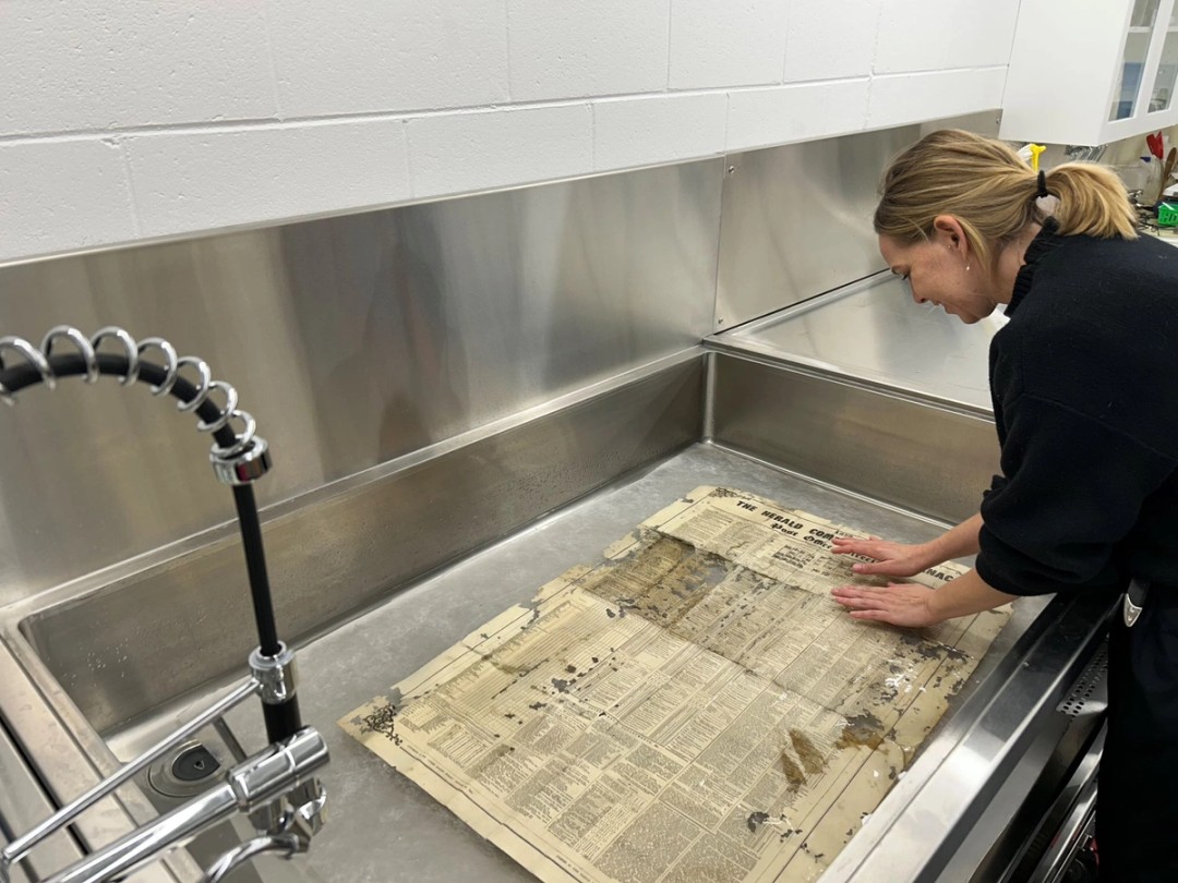 The item was then immersion washed in our new sink. Washing a paper item in an immersion bath can remove soluble staining and brighten the paper. It can also strengthen the paper fibres: when the paper soaks up the water and dries, new hydrogen bonds form between the fibres.