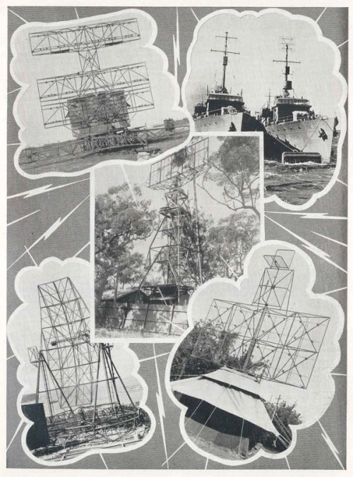 Radar systems needed to be strong enough to withstand tropical and wartime conditions, light enough to transport, easily dismantled and reassembled, and powerful enough to do the work. The Railways’ Chief Electrical Engineer’s and Mechanical Engineer’s Branches came up with a light weight antenna that used a rotating gear. It stood on top of a metal and canvas hut that housed the radar equipment. The image above is from Railways at War (Sydney, c.1947) and shows some of the aerials they designed and made.