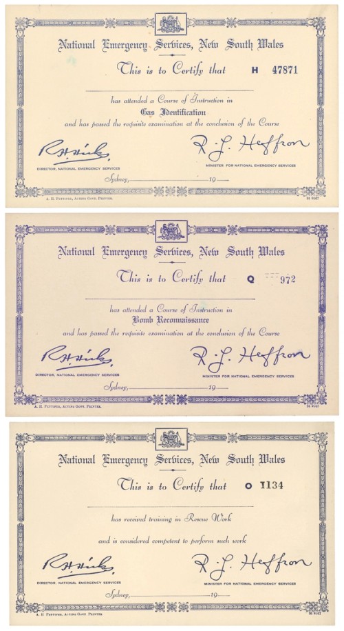 In May 1935 the Australian Government asked each State to begin making plans to protect their citizens against chemical weapons, such as poison gas bombs, carried by aircraft flying from a ship offshore. This was seen as a remote possibility but one with potentially disastrous results. The Federal Government defined the most vulnerable area in NSW as Newcastle, Sydney, Wollongong and inland to Lithgow. This area housed significant industries (including the manufacture of munitions), resources, infrastructure and population. Explosive and incendiary bombs were later added as potential threats and the State’s entire coast inland for 100 miles (161 kms) was defined as being at risk. On 1 February 1939 the plans were put into place when National Emergency Services NSW began operations.