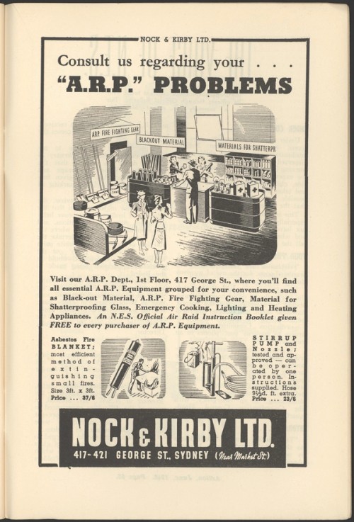 Nock and Kirby's air raid precautions department offered all that the householder needed to protect their home and person from an air raid. Items sold included blackout curtains for the windows, backyard air raid shelters and fire fighting equipment.