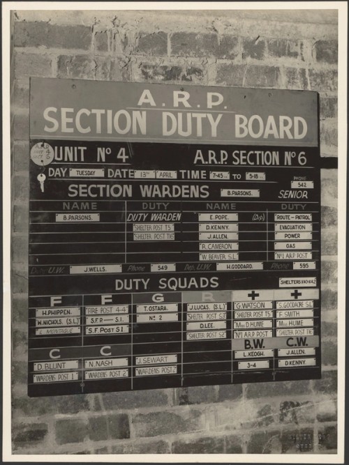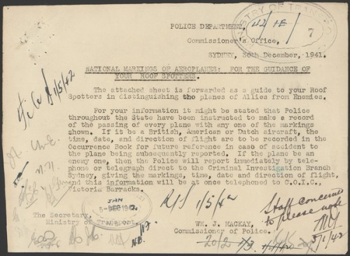 Roof spotters were part of a building's fire fighting capability. From 12 December 1941 NSW Government regulations required all government buildings and many industrial and business premises to be patrolled 24 hours a day, seven days a week, in case of air raids. Employees, usually volunteers, acted as fire wardens, first aiders and fire or roof spotters