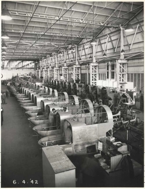 Some of the more than 2,000 male and female workers at the Dept of Aircraft Production’s factory at the Chullora Workshops, c.1943. The sign above their heads reads ‘NEAR ENOUGH IS NOT NEAR ENOUGH. BE EXACT!’ A second sign visible in other photos states ‘A CONCEALED MISTAKE IS A CRIME! IT MAY COST A BRAVE MAN HIS LIFE’. Production of the Beaufort Bomber began in 1940 and ended in April 1944. As well as the 700 Beaufort bomber sets produced and spare parts, segments of the Beaufighter and Lincoln airplanes were also constructed at Chullora.