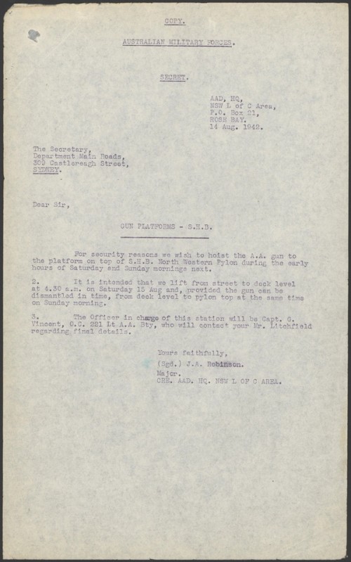 Private property and parklands were taken over by the Commonwealth for the duration of the war for a variety of war-related uses. In 1938 the pylons of the Sydney Harbour Bridge had been inspected to find the best sites for fixing machine guns. From 13-15 November 1939 the No. 5 Section, 1st Anti-Aircraft Battery (Lewis Gun Section) held training exercises in all four pylons. A memo from 25 April 1942 describes an inspection of the Bridge pylons by the Army prior to them taking over control of all four pylons and guns being erected in two of them. The pylons were also used for troop accommodation.