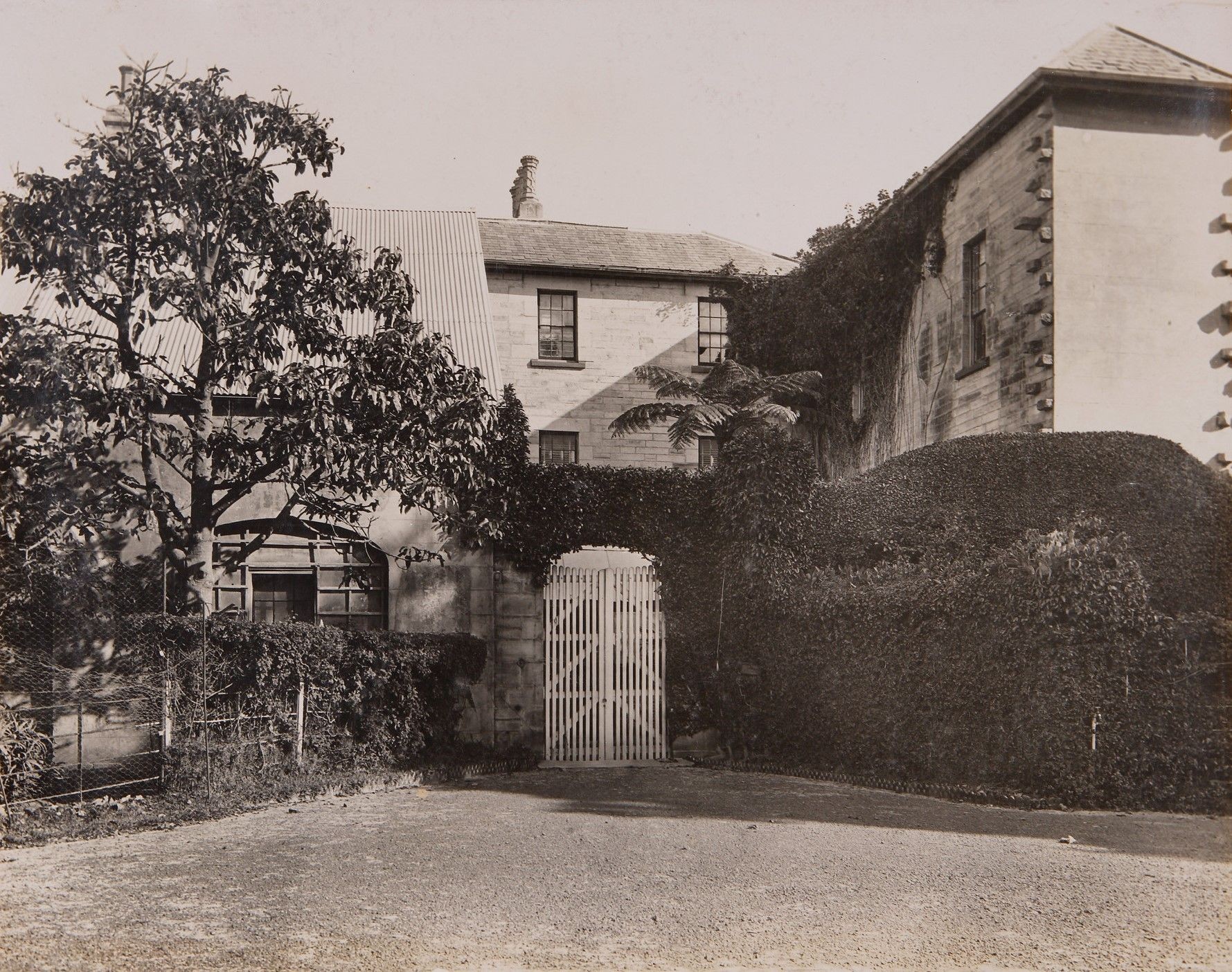 The Nielsen-Vaucluse Park Trust was formed to care for the property, opening first the gardens in 1911, and then the house in 1915 as a ‘Museum of Australian Historical Objects’. At this time the gardens developed a municipal character, with bitumen and, later, concrete paths laid and decorative plantings added. The entry gate piers were relocated to their current location to form the main entrance. Most significantly, a general ‘tidying up’ began. This involved demolishing structures, including the outlying workers’ cottages and picturesque convict barracks; ‘completing’ the rooftop crenellations and creating a flat roof open to visitors; lining the creek with stone; and installing stone-edged garden beds across the grounds.