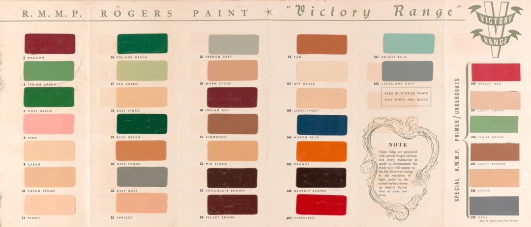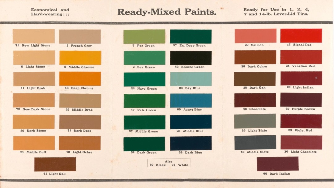 Paint charts from the late 1800s show a limited range of colours, predominantly shades of green and earthy tones such as drab (a dull light brown), buff and brown. At the turn of the 20th century, colours remained muted, with pastels – soft greens, yellows and pinks – becoming increasingly popular.